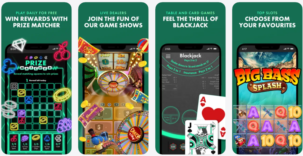 - Full game suite: slots, blackjack, roulette, live dealer